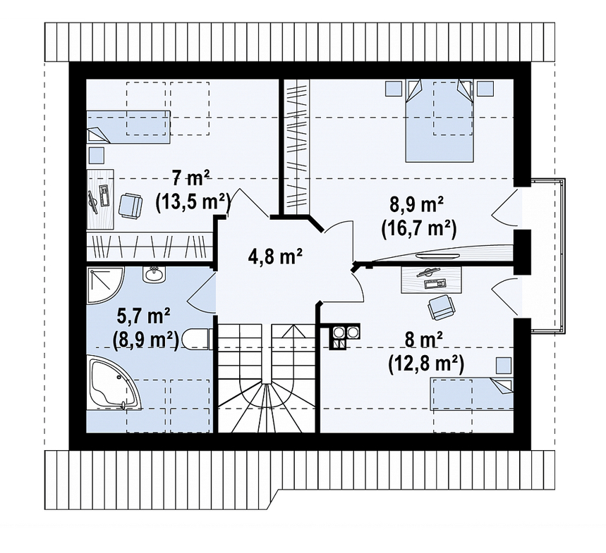 Na poddaszu projekt domu przewiduje dwie przestronne sypialnie dzieci i duży pokój rodziców z garderobą.